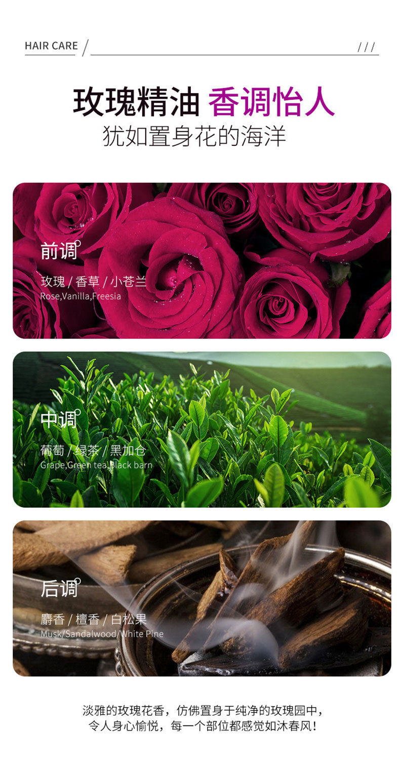 添加玫瑰精油,滋养头发,舒缓头皮,散发玫瑰香味,令人心旷神怡!