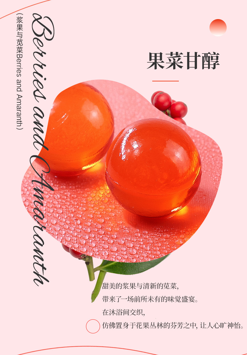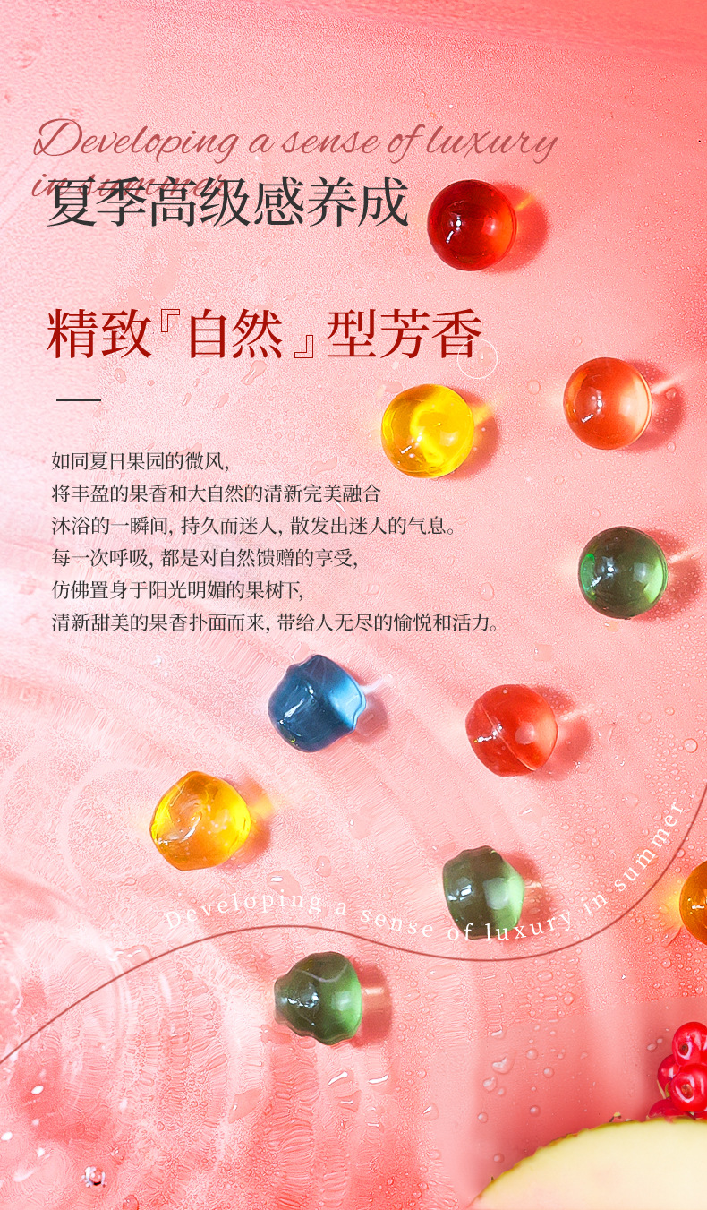 果香味滋养沐浴珠,护肤滋润,持久保湿防止干燥紧绷,淋浴后肌肤嫩滑如丝,光彩动人。